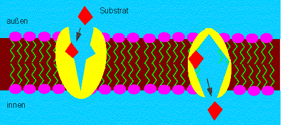 Beteiligung eines Carrierproteins am aktiven Transport bestimmter Moleküle durch die Membran. Der Transportvorgang ist spezifisch und energieaufwendig. Während des Transports macht das Protein eine Konformationsänderung durch (ping-pong Mechanismus).