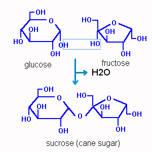 (The two structures above show the five main fatty acids found in plant lipids. Generally speaking the unsaturated acids (oleic, linoleic and linolenic acids) are more fluid (and nutritionally desirable) than the saturated acids (palmitic and stearic). Margarines are often made from plant oils by chemically hydrogenating the fatty acids; this makes them more saturated and more solid. Cuticular lipids are a complex mix of hydrocarbons and esters of long chain aliphatic acids and alcohols embedded in a lipid polymer called cutin. Waxes and cutin make up the cuticle which is a water-retaining barrier around the above ground parts of plants. As their name implies carbohydrates are composed of the elements of water and carbon so their formula approximates to a multiple of CH2O. Most of the dry weight of plants is carbohydrate of one kind or another. All carbohydrates are polar and the low-molecular forms are what we commonly know as sugars. Sugars are freely soluble in water. The simplest is the three carbon sugar, glyceraldehyde but most of the carbohydrates in plants are based on glucose or other six carbon sugars. Like other sugars glucose can exist in two basic forms, an open chain or a ring structure. When the ring closes the OH group on the last carbon can be up (beta) or down (alpha). This then influences how the sugars can be joined together in larger molecules. When sugars move around the plant they are usually in the form of sucrose in which glucose and fructose are joined by a glycosidic bond. This bond is made by removing the elements of water from two sugars. It can be broken by re-introducing those elements - the process of hydrolysis ("water splitting") can often be accomplished by heating in acidic solution. For example corn syrup is made by heating starch from corn in dilute acid. Organisms use enzymes to carry out this kind of reaction without heating and in neutral solution. Polysaccharides are made up by joining hundreds of monosaccharides by glycosidic bonds. The most common food reserve in plants is starch which you probably know can be dissolved in boiling water: Joining glucose in the beta configuration produces a very different polysaccharide,cellulose. This is completely insoluble in water and is the most important structural component of plant cell walls: Another important cell wall component, particularly in herbaceous tissue is pectin. This is made up of a modified sugar, galacturonic acid and in the plant the carboxyl groups are esterified with methyl (CH3) groups which are not shown in the picture: Fungal cell walls are made of chitin a polymer of N-acetyl glucosamine. The kind of cell wall that an organism makes is a fundamental property that cannot easily be changed. So the fact that true fungi have chitin cell walls makes them more like animals than plants. Conversely the water molds have cellulose cell walls that make them more plant-like, so they have been separated from the fungi in modern classification. Continue to proteins and nucleic acids Copyright © Michael Knee |