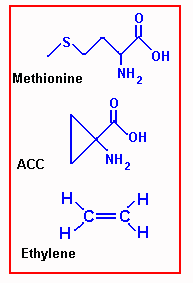 Ethylene is the only gaseous hormone in the plant world; it is a simple hydrocarbon gas that is derived from the amino acid, methionine, via an unusual cyclic compound which is also an amino acid, ACC (1-aminocyclopropane-1-carboxylic acid). |