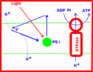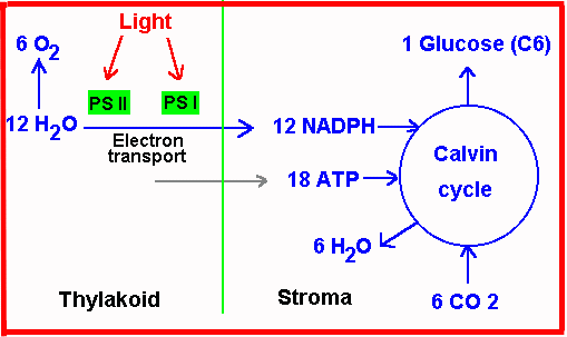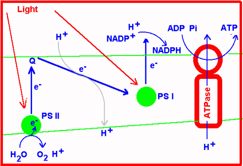 There is the possibility that electrons fall back into the electron transport chain to produce more ATP but no NADPH - this is cyclic phosphorylation. However, the Z pathway or non-cyclic phosphorylation is required for carbohydrate synthesis. (the cyclic path tops up ATP) |